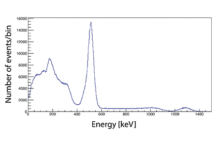 Pulse charge spectrum obtained with a source of 22Na and with a LYSO mounted on an SIPM, after external linerisation. The charge signal is integrated in a time window of 350ns. The energy resolution at 511 keV is 10.5%.