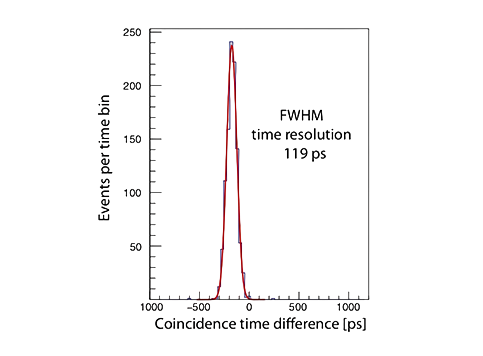 Time difference between the two signals from a positron annihilation event. Measured at 15°C with a 22Na point source and two 2x2x3 mm3 LYSO:Ce crystals coupled to two Hamamatsu S13361-3050AE MPPC arrays.