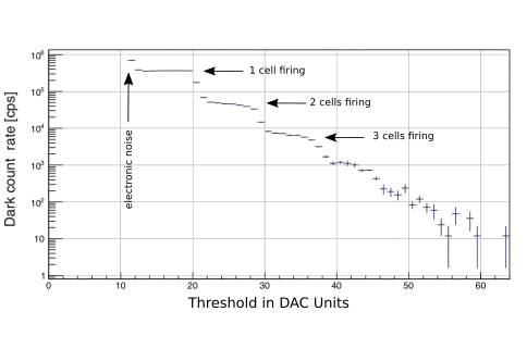 TOFPET2 internal counter data showing characteristic ladder pattern. As threshold increases, steps reveal distinct SIPM firing levels (1, 2, 3+ cells), allowing threshold calibration via SiPM dark count analysis.